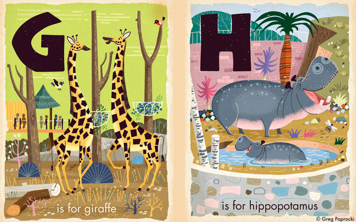 An engaging collection of 26 illustrations featuring every child’s favorite zoo animals from around the world, from apes to zebras, all shown in their natural habitats. Illustrator Greg Paprocki’s popular BabyLit alphabet board books feature his classically retro midcentury art style that’s proven to be a hit with both toddlers and adults alike. Have fun discovering new details in each illustration with every successive reading.